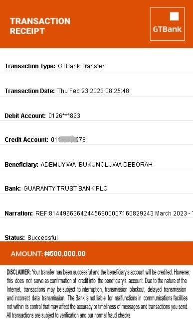 Here is a receipt of the transfer we made to Ademuyiwa Esther's mum