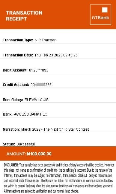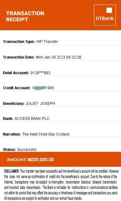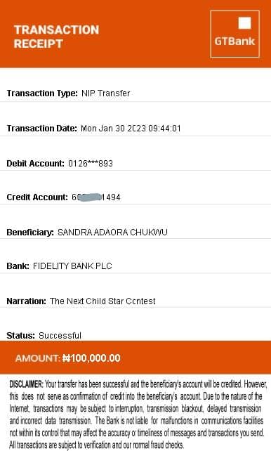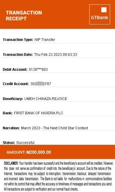 Here is a receipt of the transfer we made to Great Nwaigwe's mum
