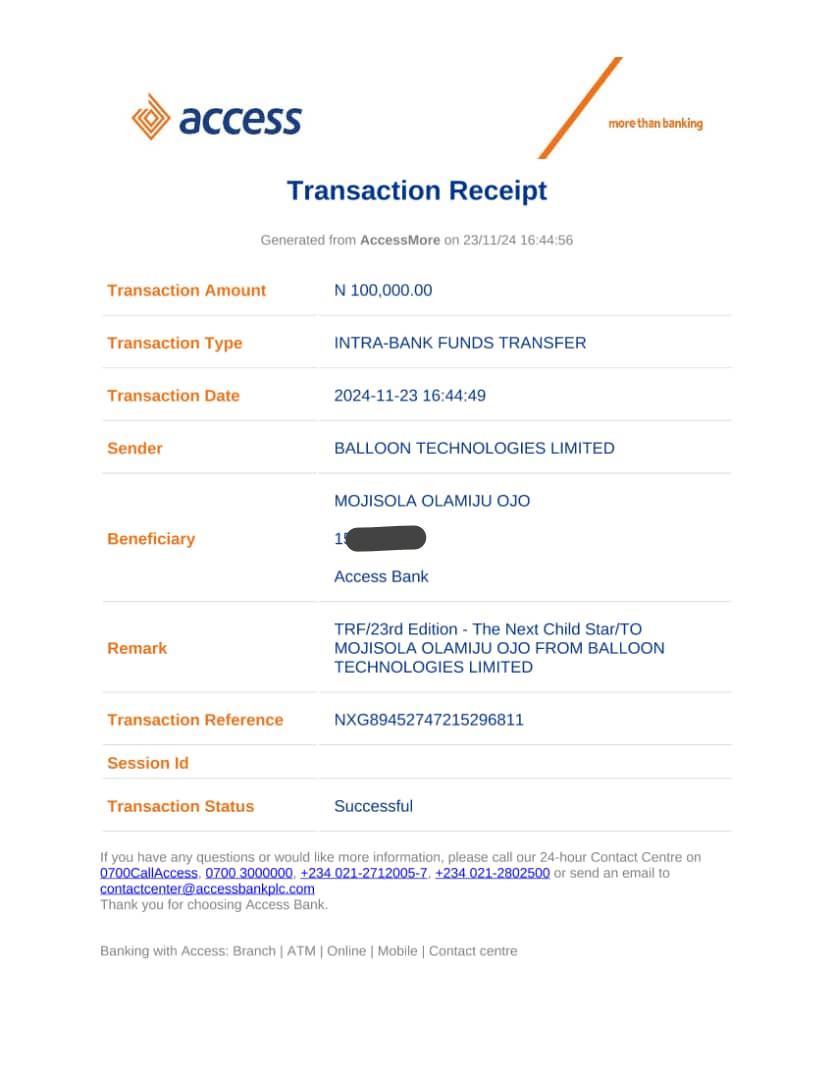 Here is a receipt of the transfer we made to Michelle Oparinde