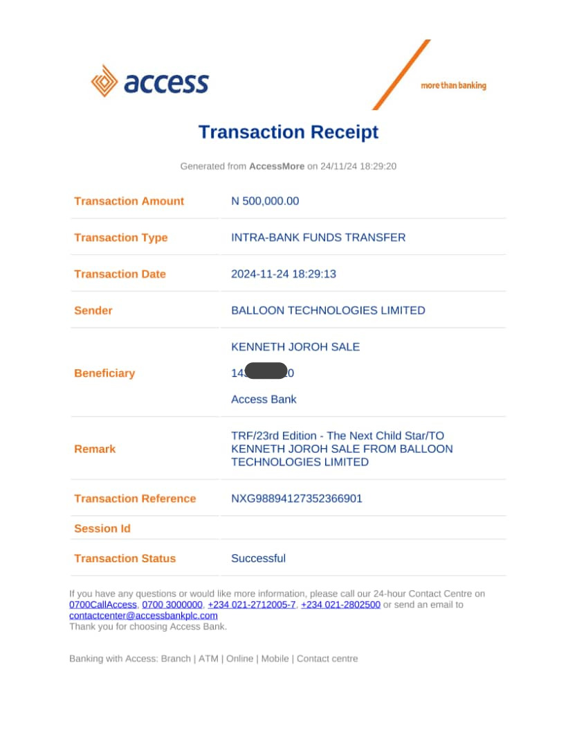 Here is a receipt of the transfer we made to Precious Gbajabiamila