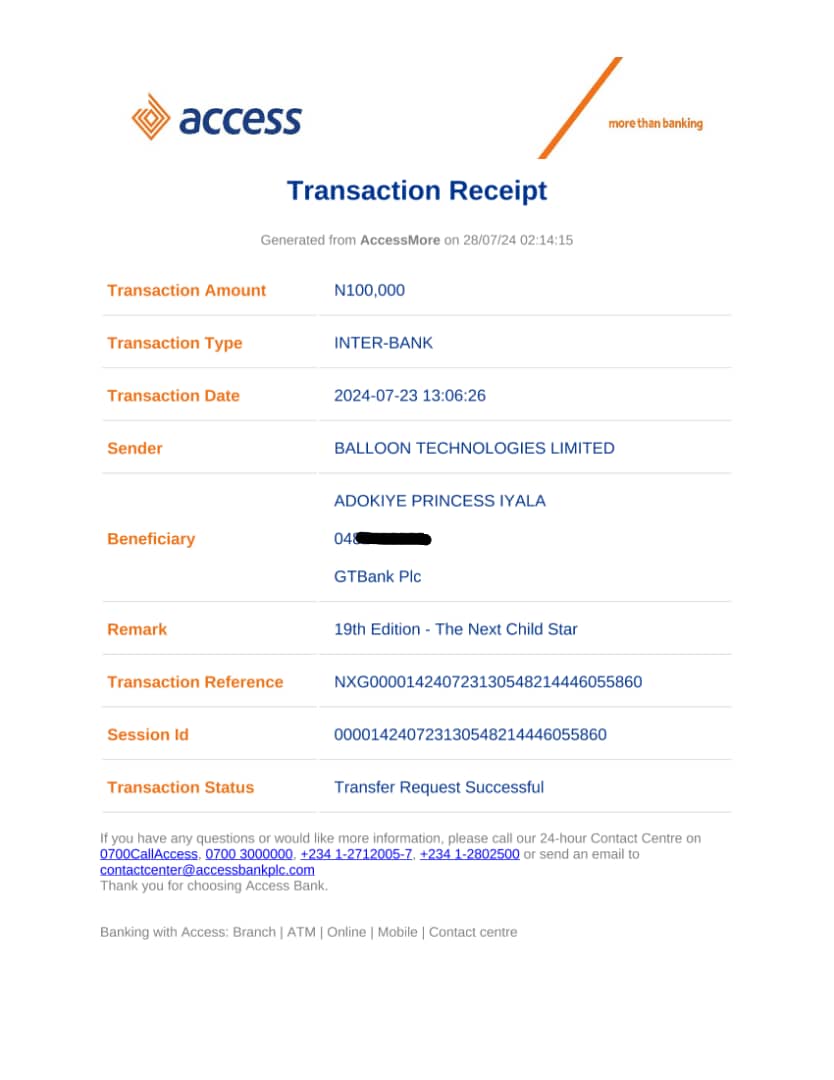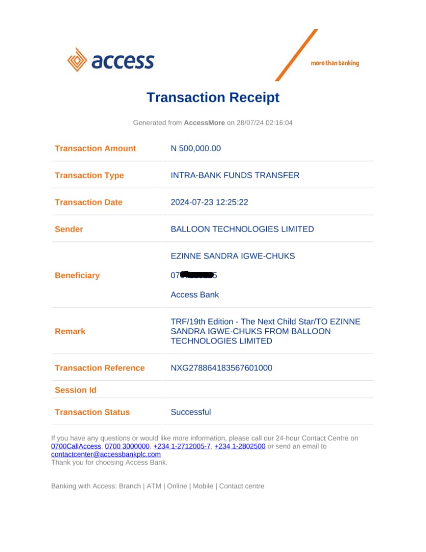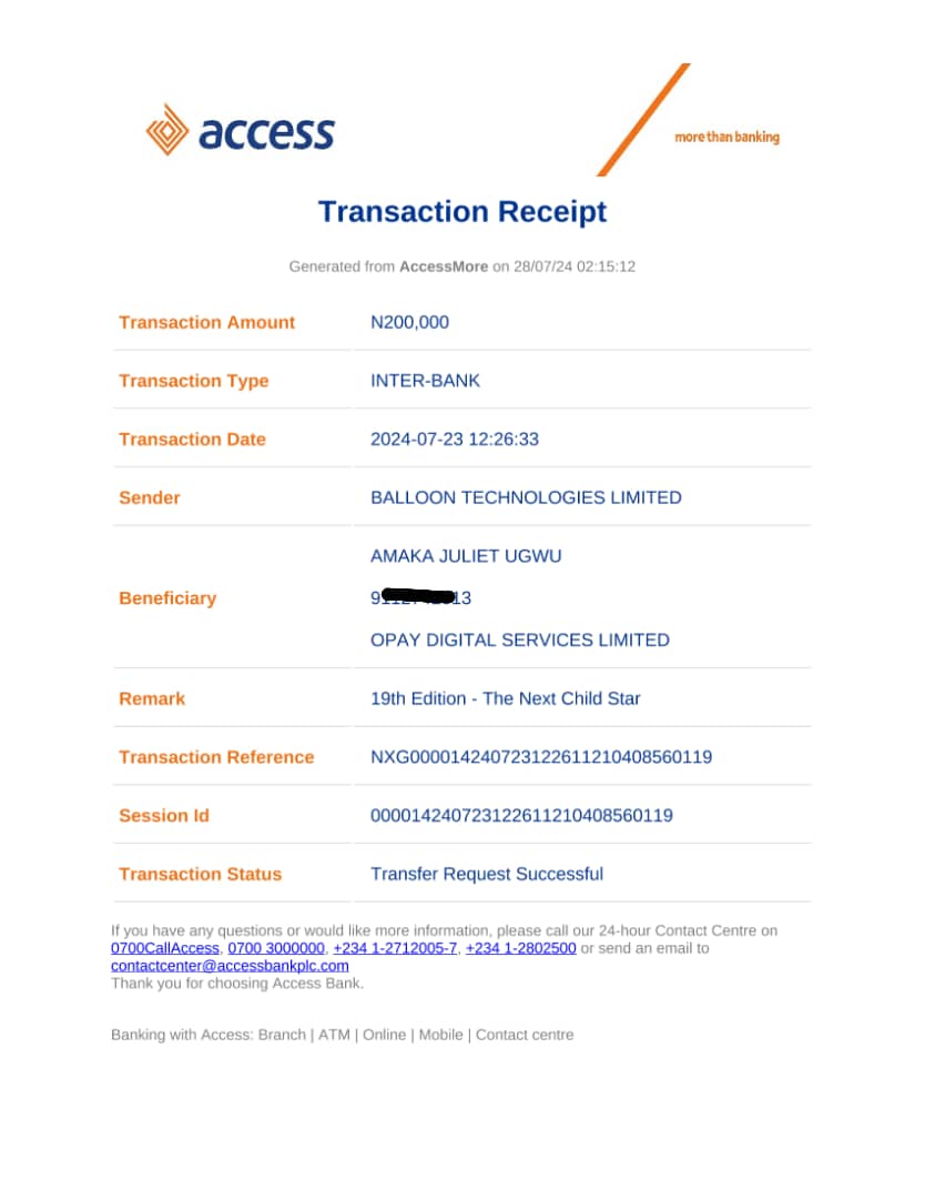 Here is a receipt of the transfer we made to Ugwu Chidera