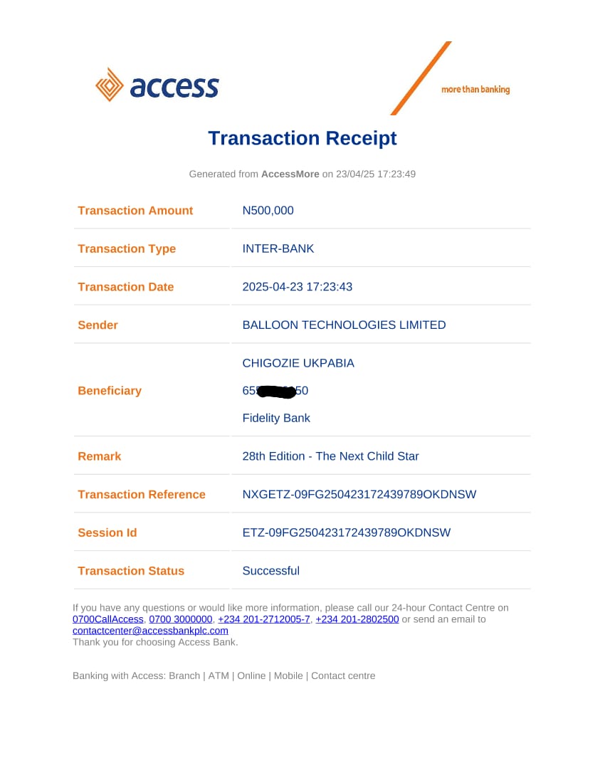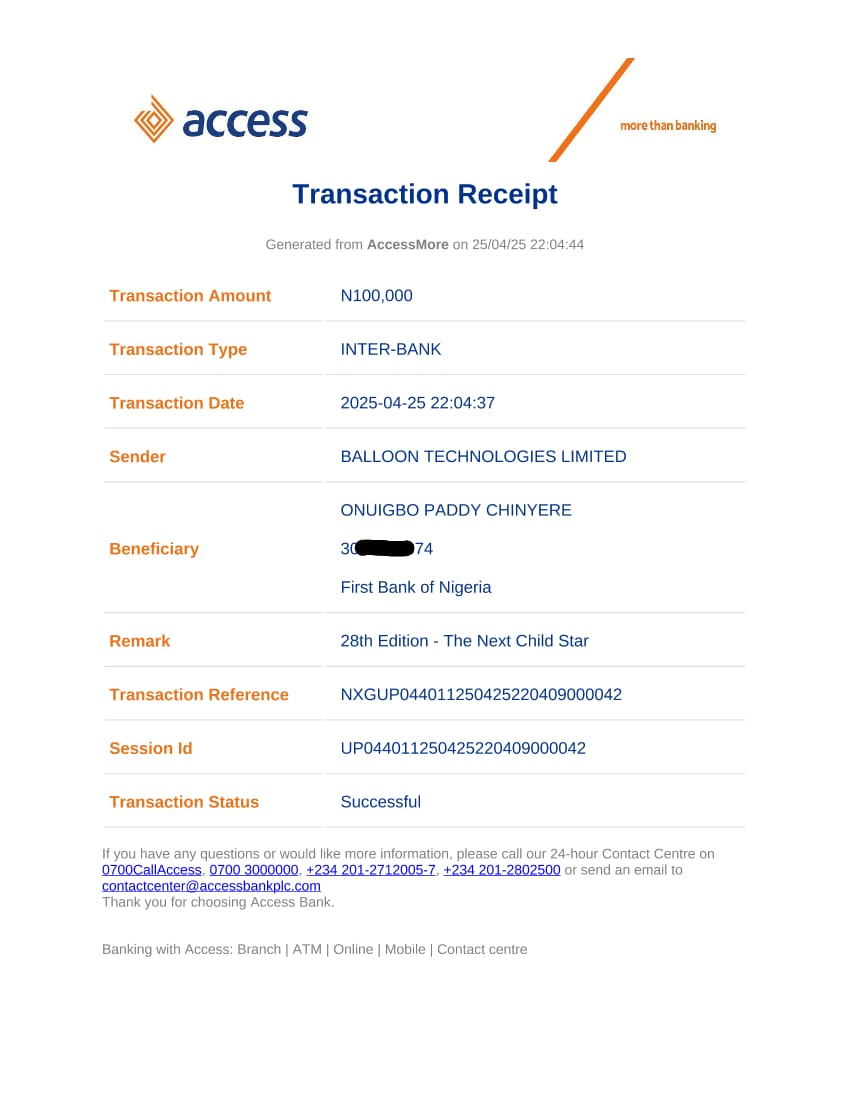 Here is a receipt of the transfer we made to Onuigbo Emmanuella