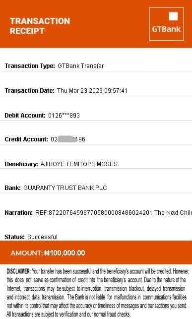 Here is a receipt of the transfer we made to Excel Ajiboye's Dad