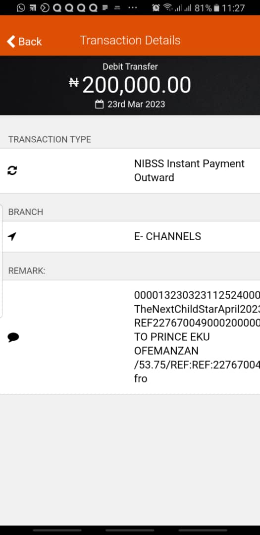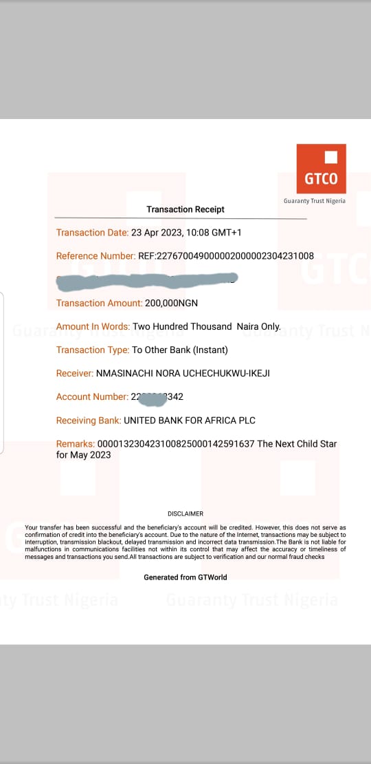 Here is a receipt of the transfer we made to Ikeji Uchechukwu Nmasinachi's mum