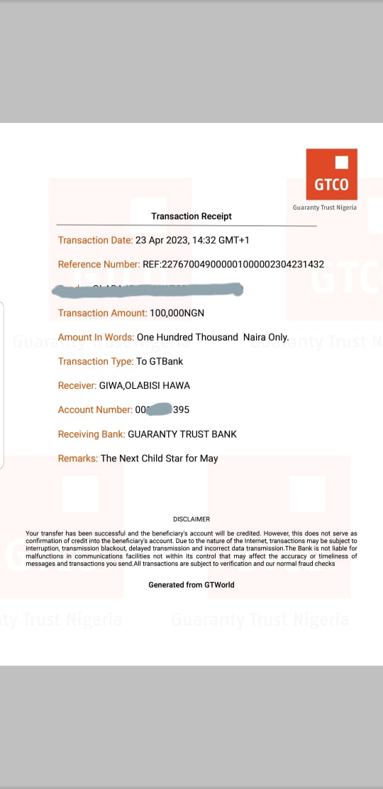 Here is a receipt of the transfer we made to Onikoyi Bariah's Mum