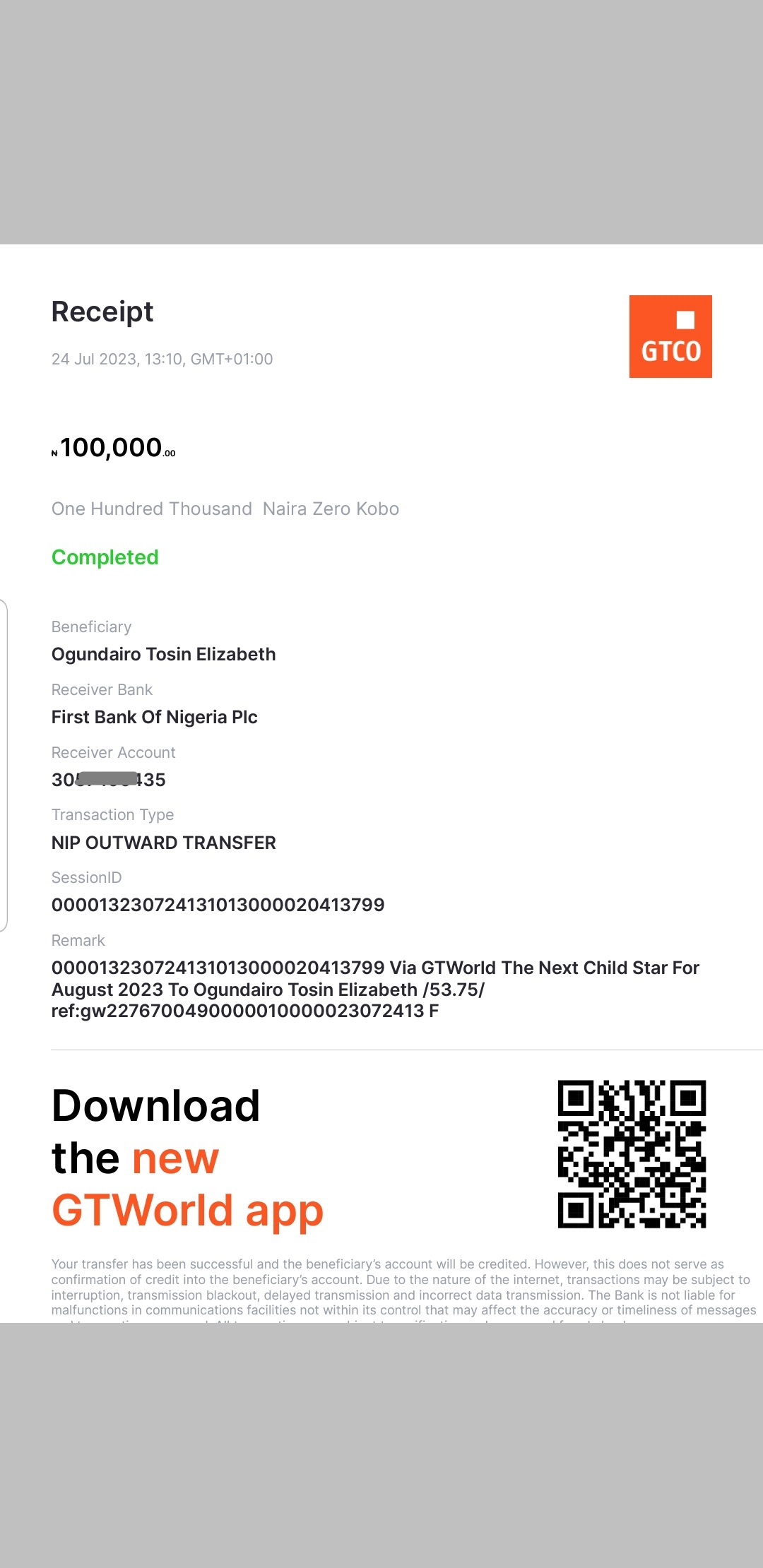 Here is a receipt of the transfer we made to Adeyemi inioluwa's Mum