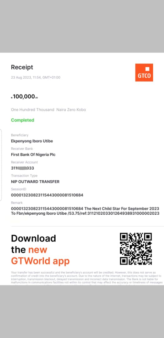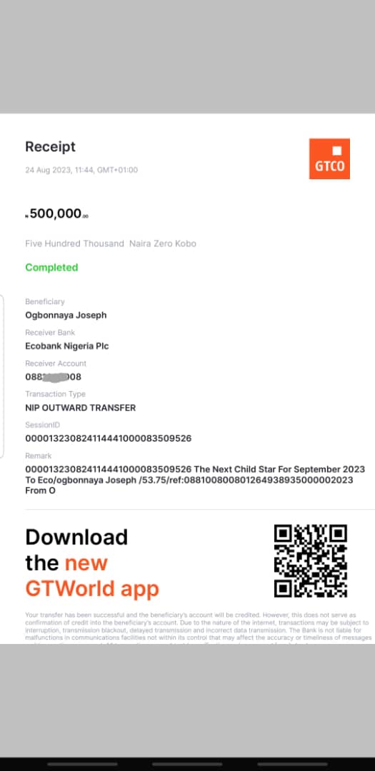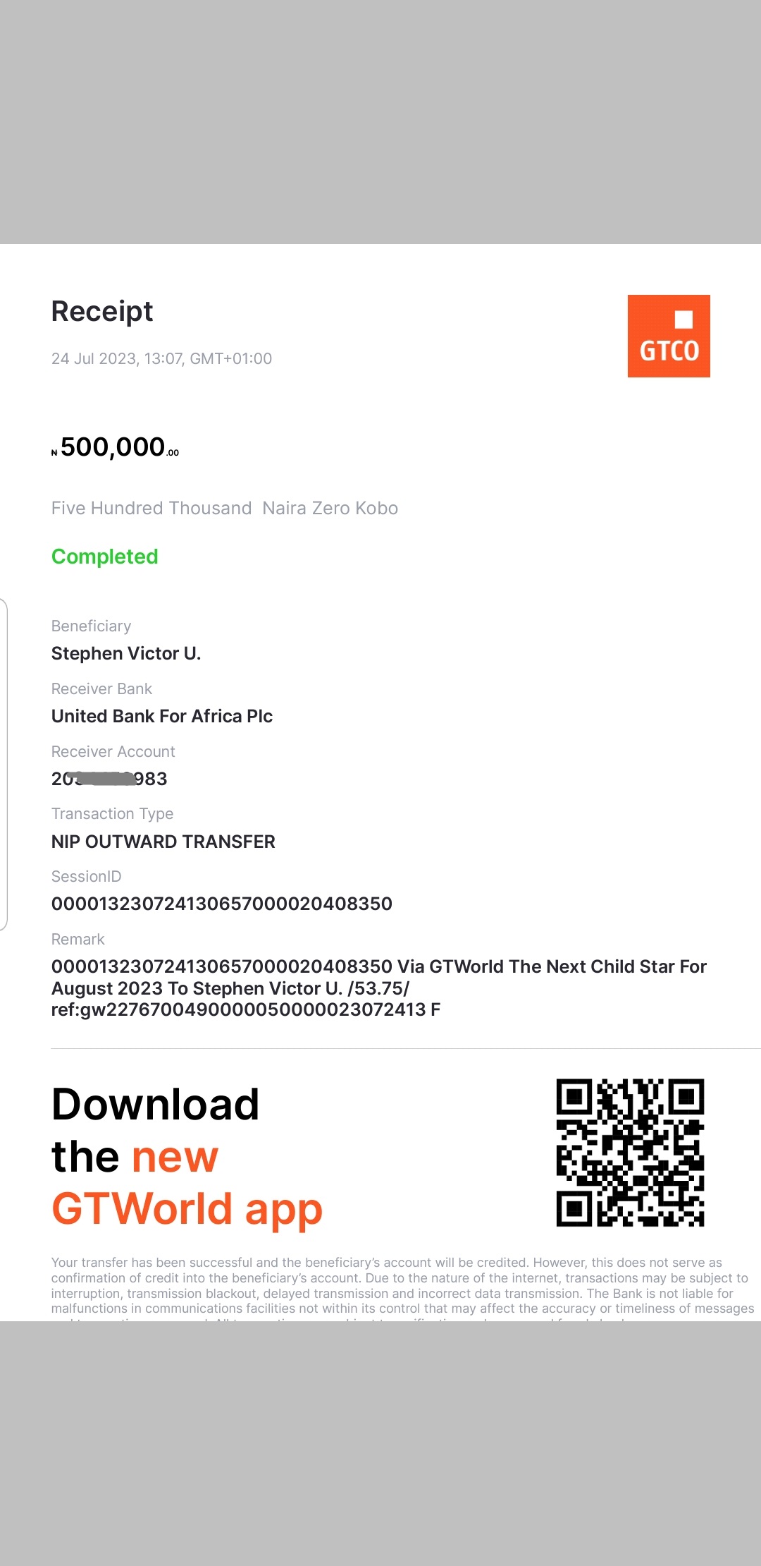 Here is a receipt of the transfer we made to Godswill Victor Stephen's Mum